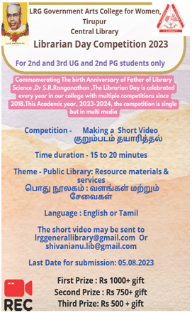 Librarian Day is celebrated to commemorate the birth Anniversary of Dr S.R.Ranganathan,Father of Library and Information Science in India.The students are encouraged to participate in various competitions arranged as a part of the celebration.Celebrities and High Officials are invited for special Lecture and Prizes are distributed on the Librarian Day.